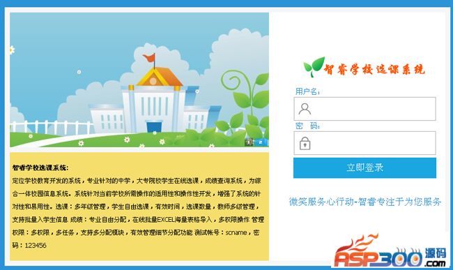 智睿学校选课系统定位学校教育开发的系统,专业针对的中学,大专院校学生在线选课,成绩查询系统,为综合一体校园信息系统。系统针对当前学校所需操作的适用性和操作性开发,增强了系统的针对性和易用性。